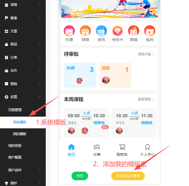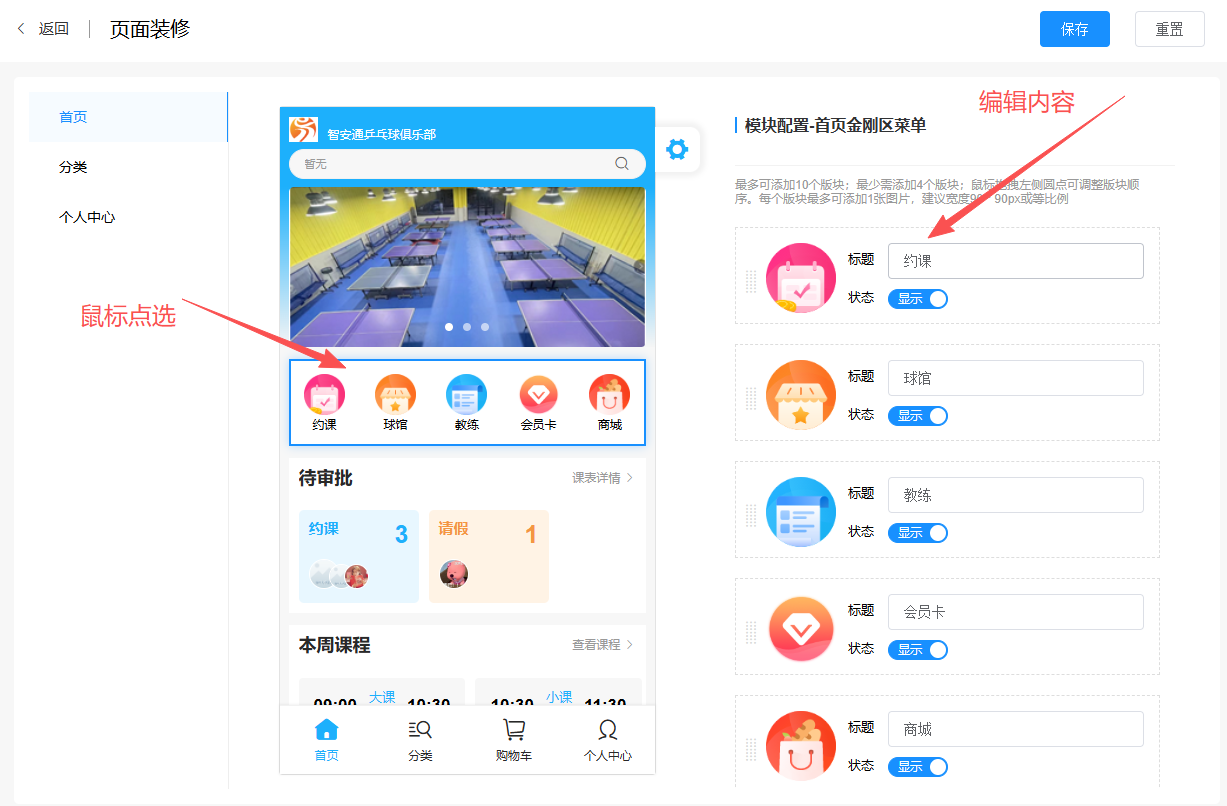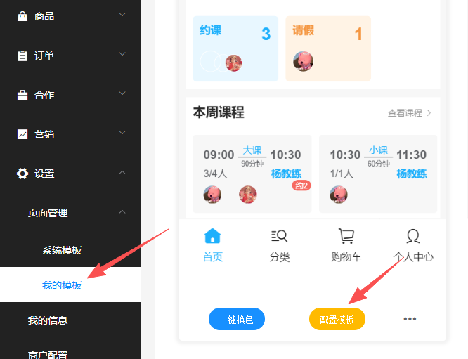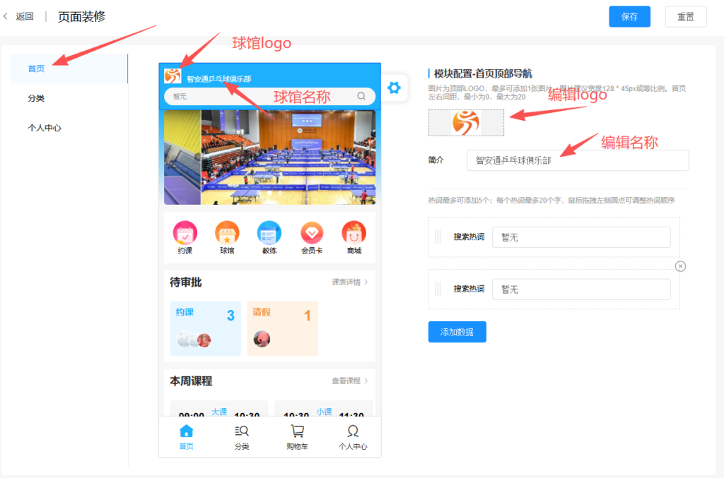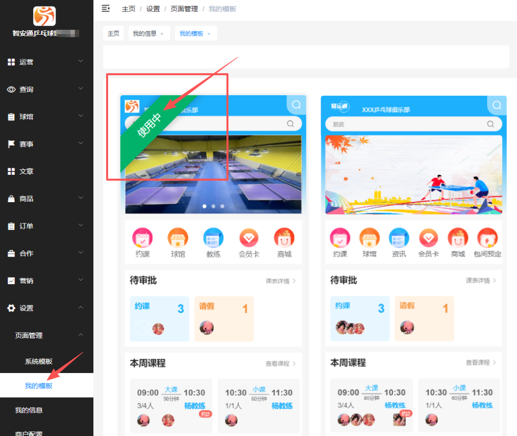 小程序外观配置 设置球馆环境内容并分享 球馆的内容设置在PC端设置,首先登陆PC端。通过球馆管理员的手机号和密码登录后台管理系统。 登录PC端后台,在点击“设置/页面管理/我的模版”,导入系统模版到“我的模版” 我的模版 自己球馆的内容在“我的模版”里进行配置。 选择正在使用的模版,鼠标停留底部,进行配置模版编辑。 配置模版中可以进行球馆logo、标题、首页轮播图、首页快捷区等编辑。 用鼠标分别选取页面上不同的内容,可以进行编辑。 文档导航← 创建第一个球馆球馆展示配置 →
